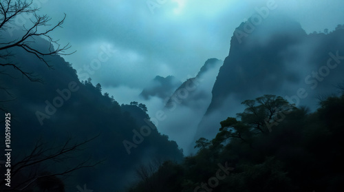 Fototapeta premium Misty mountain landscape at dawn with dense fog and towering peaks.