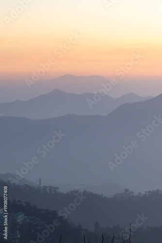 Obraz premium misty mountain landscape at dawn with orange sky and layered hills