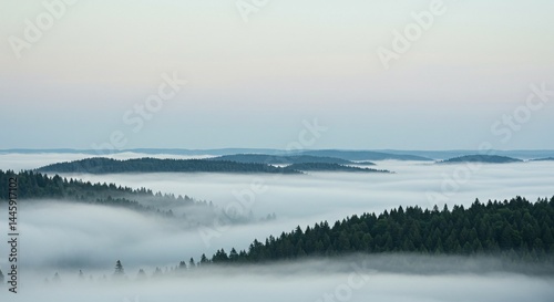 Fototapeta premium Misty Mountain Landscape Serene View of Fog Enveloping Evergreen Forest Hills...