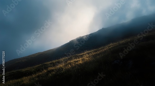 Fototapeta premium Misty Mountain Landscape: Sunlight Through Fog