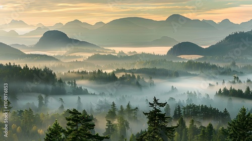 Fototapeta premium Misty Mountain Landscape Sunrise Over Forest