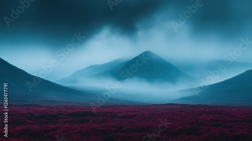 Fototapeta premium Misty mountain landscape, vibrant pink flowers, dramatic sky. Possible use...