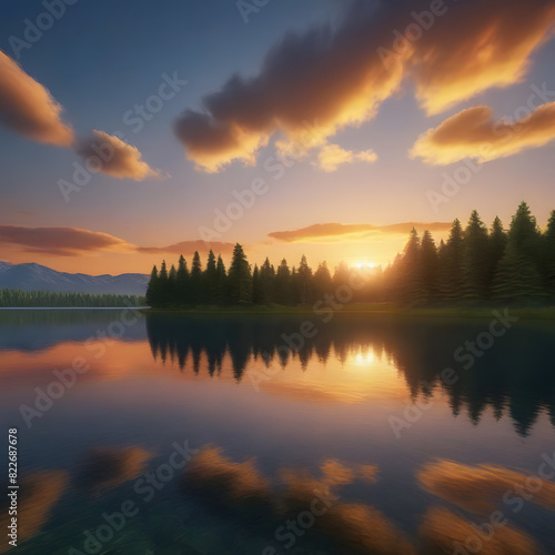 © Yeva Pysmenna, Fototapeta premium Misty mountain landscape with golden autumn trees reflecting on calm lake serene nature scene