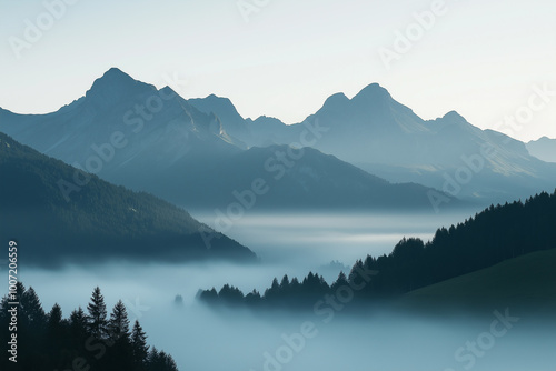 Naklejka premium Misty mountain landscape with layers of trees and fog at sunrise for nature, travel, or scenic concepts focused on beauty, tranquility, and natural landscapes