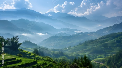 Fototapeta premium Misty Mountain Landscape with Rice Terraces