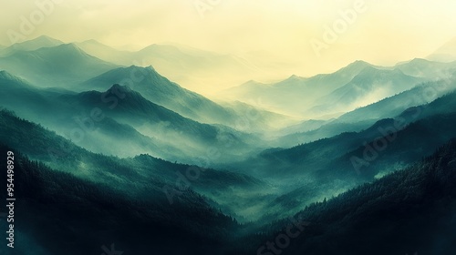 © andryan, Fototapeta premium Misty Mountain Landscape with Rolling Hills and Forested Slopes