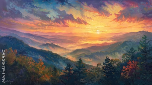 Fototapeta premium Misty mountain landscape with stunning sunset.