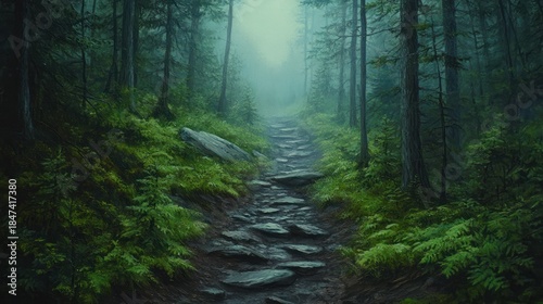 © TITISCAHYA, Fototapeta premium Misty mountain path through a dark forest