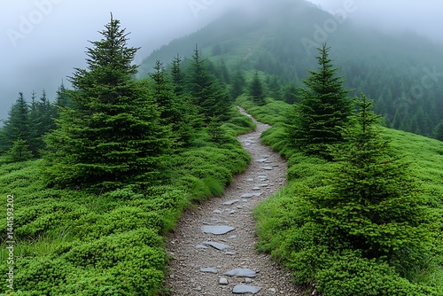 © Dimas, Fototapeta premium Misty mountain path winding through lush greenery.