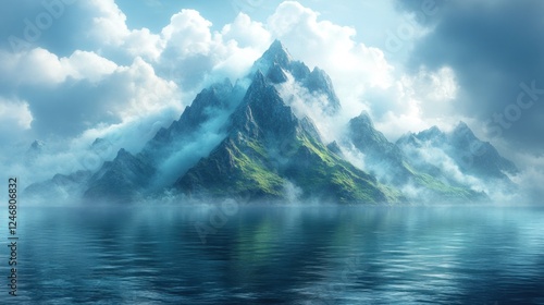 © RONNY, Naklejka premium Misty mountain peak, serene lake, cloudscape, travel poster