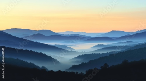 © shobakhul, Fototapeta premium Misty mountain range at dawn.