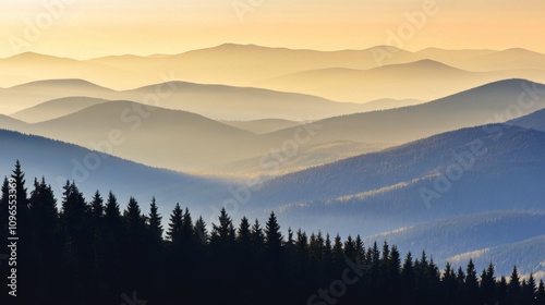 © Younes, Obraz premium Misty Mountain Range at Sunrise