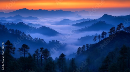 © Rakib, Fototapeta premium Misty mountain range at sunrise.