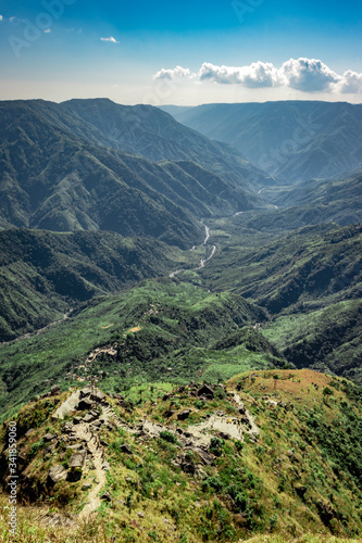 © explorewithinfo, Fototapeta premium misty mountain range covered with white mist and amazing blue sky