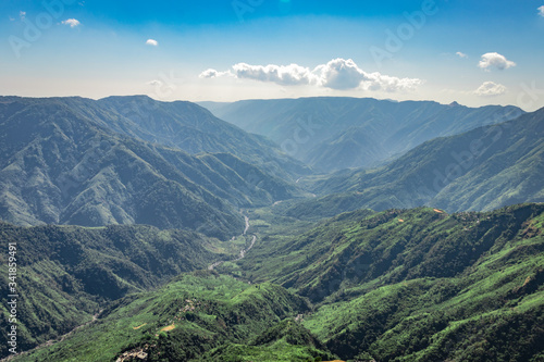 Fototapeta premium misty mountain range covered with white mist and amazing blue sky