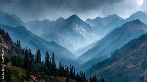 Obraz premium Misty mountain range landscape with pine trees