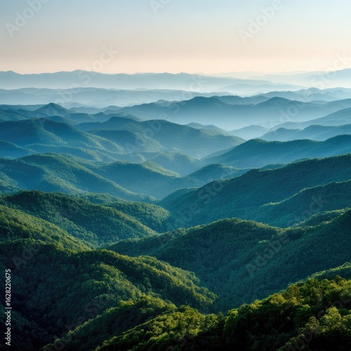 © Kursi, Fototapeta premium Misty mountain range, layers of green and blue