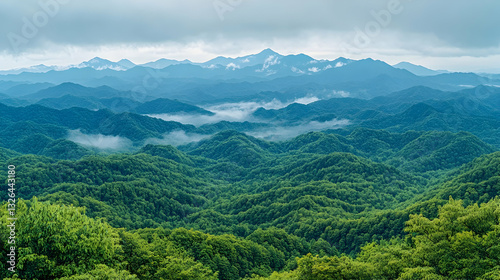 © indah, Fototapeta premium Misty Mountain Range. Lush Forest