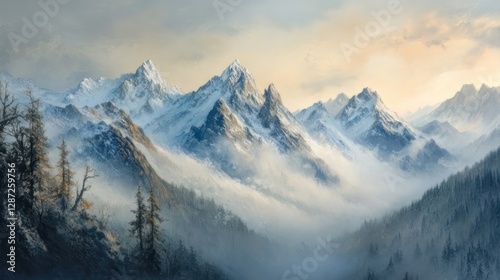 © ULFAITA, Obraz premium Misty Mountain Range Sunrise