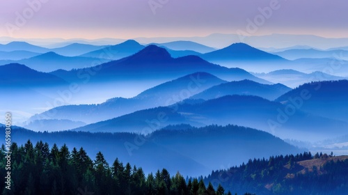 © Maria, Obraz premium Misty mountain range with layers of blue hills