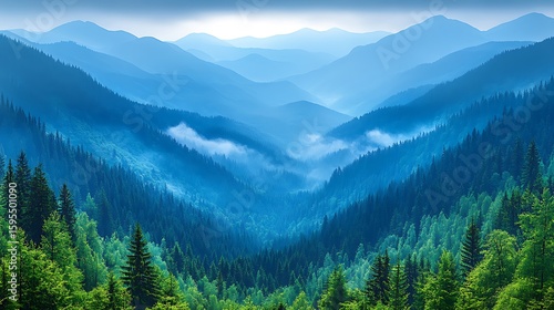 © yogiandrias, Obraz premium Misty mountain range with lush forests.