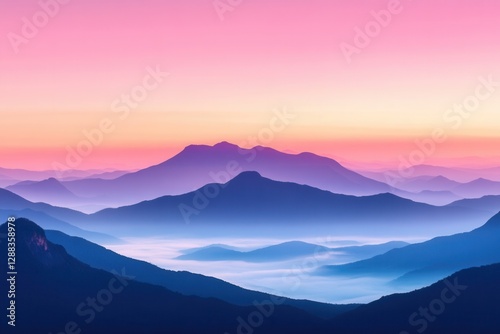 © Tanarak, Obraz premium Misty Mountain Ranges At Sunrise