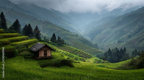 © Ardian, Fototapeta premium Misty Mountain Rice Terraces Landscape with Hut