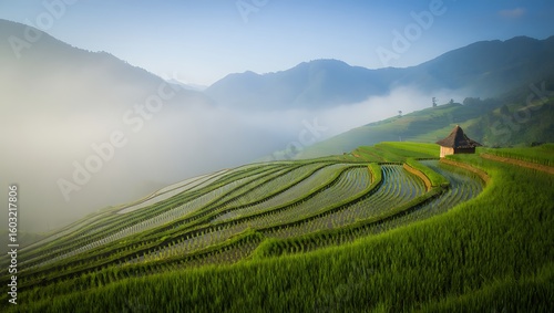 © Prosenjit Barman, Fototapeta premium Misty mountain rice terraces with a small hut