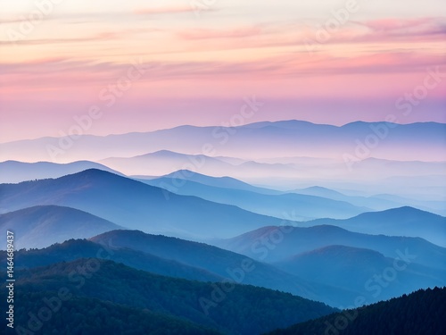 © Yauhen, Obraz premium Misty mountain ridges at sunrise with pastel colorful sky layers
