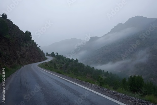 Naklejka premium Misty Mountain Road Winding Through Foggy Valley