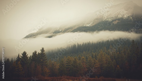 Fototapeta premium Misty mountain scenery featuring a fir forest, suitable for editorial...