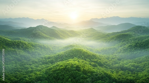 Naklejka premium Misty Mountain Sunrise: A Breathtaking Aerial View of Verdant Hills