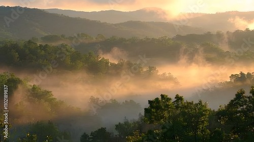 © irawan, Fototapeta premium Misty Mountain Sunrise Over Lush Green Valley
