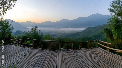 © smevg, Obraz premium Misty Mountain Sunrise: Panoramic View from a Bamboo Deck