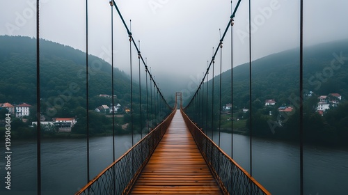 © Shehub, Obraz premium Misty Mountain Suspension Bridge Wooden Path Landscape