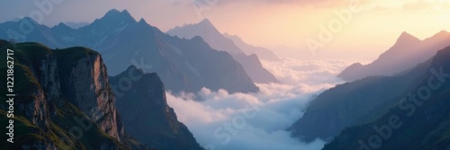 Obraz premium Misty mountain tops shine with soft gentle light amidst rugged large cliffs,...