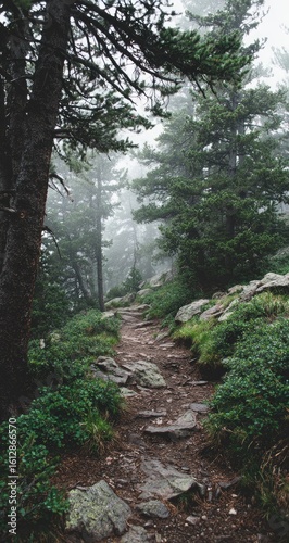 © Sufyan, Obraz premium Misty mountain trail winds through dense evergreen forest, rocky terrain and low-lying vegetation