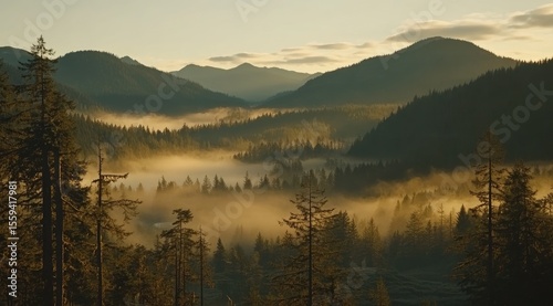 Fototapeta premium Misty mountain valley at dawn
