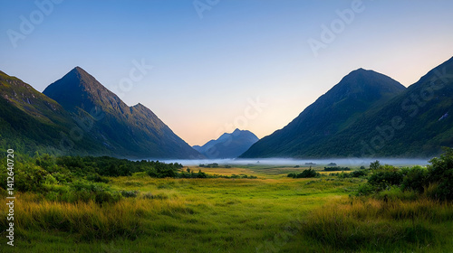 © artzone, Fototapeta premium Misty Mountain Valley at Sunrise