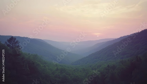 © ABDA, Obraz premium Misty mountain valley at sunset