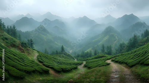 © Adi, Obraz premium Misty Mountain Valley Landscape In Southeast Asia