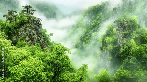 © Arfi, Obraz premium Misty mountain valley shrouded in lush green forests