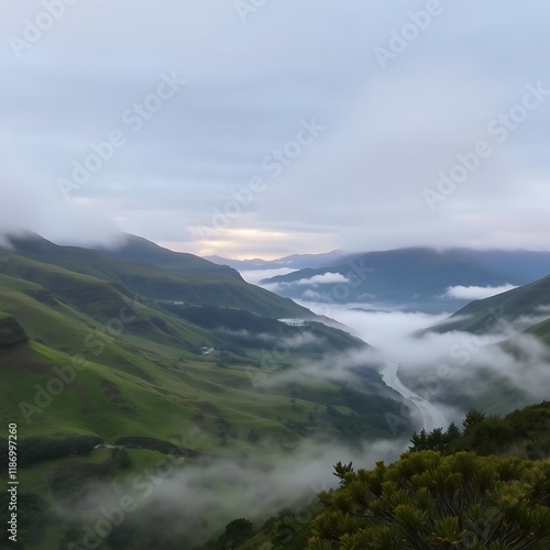 © jancukers, Fototapeta premium Misty mountain valley sunrise.