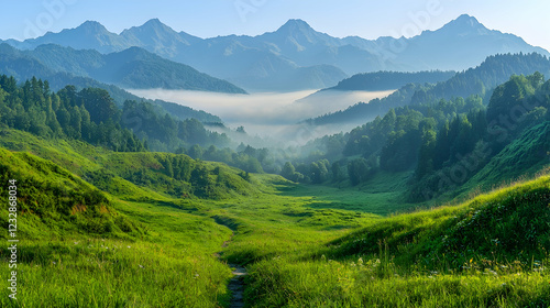Fototapeta premium Misty mountain valley sunrise, green hills, scenic view, nature wallpaper