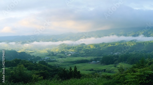 © NAIMAH, Fototapeta premium Misty mountain valley sunrise, rural village, scenic landscape, travel poster