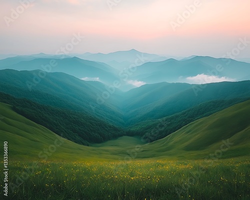 © Adobe, Fototapeta premium Misty Mountain Valley Sunset.