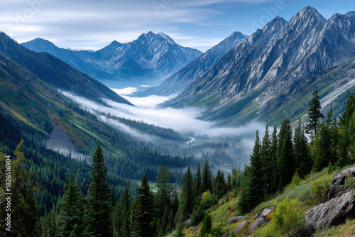 Fototapeta premium Misty Mountain Valley with Evergreen Forest and Peaks
