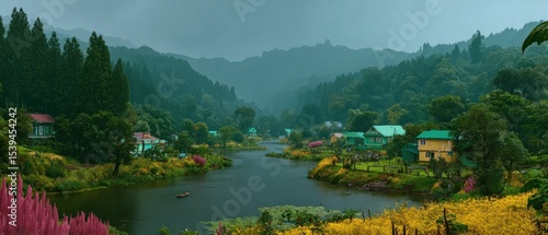 © Pay, Fototapeta premium Misty mountain village by a river
