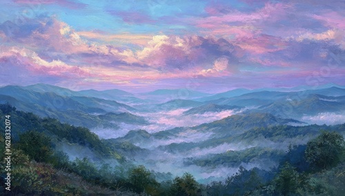 © taufik, Obraz premium Misty mountain vista at dawn. Soft colors paint a tranquil mountain range, shrouded in a light mist, with pastel clouds