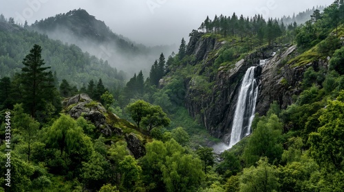 © putri, Fototapeta premium Misty mountain waterfall scene. Lush green valley